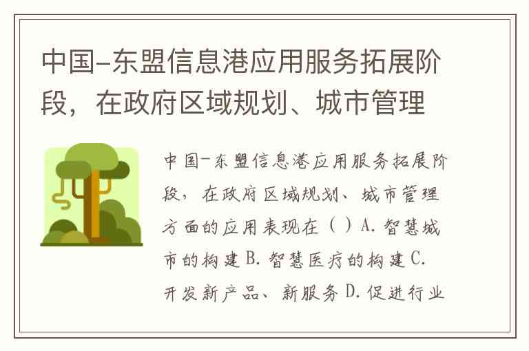 中国-东盟信息港应用服务拓展阶段,在政府区域规划、城市管理方面的应用表现在()A.智慧城市的构建 B.智慧医疗的构建 C.开发新产品、新服务 D.促进行业产品或生产方式的更新换代