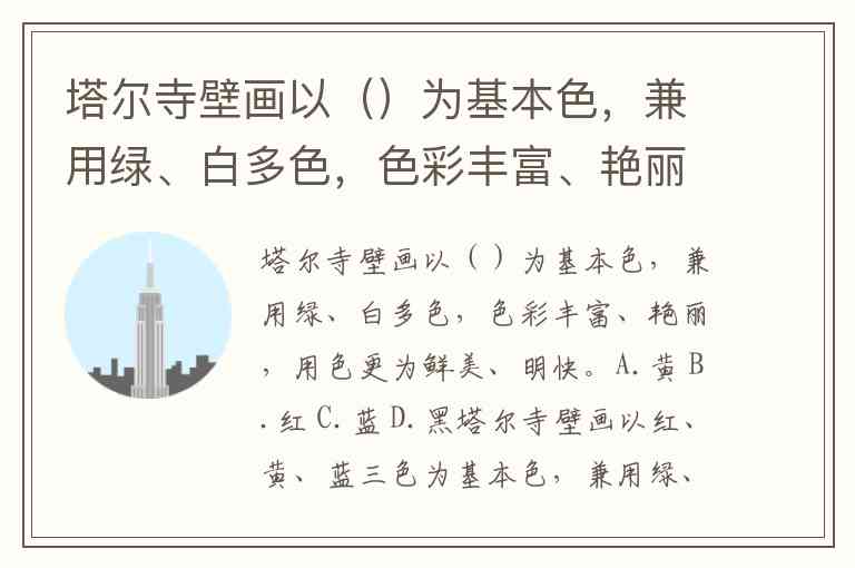 塔尔寺壁画以()为基本色,兼用绿、白多色,色彩丰富、艳丽,用色更为鲜美、明快。A.黄 B.红 C.蓝 D.黑