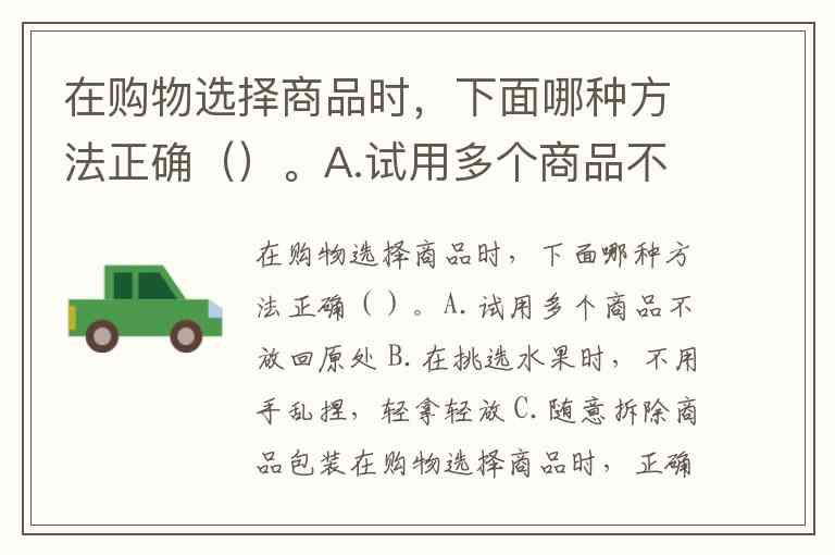 在购物选择商品时,下面哪种方法正确()。A.试用多个商品不放回原处 B.在挑选水果时,不用手乱捏,轻拿轻放 C.随意拆除商品包装