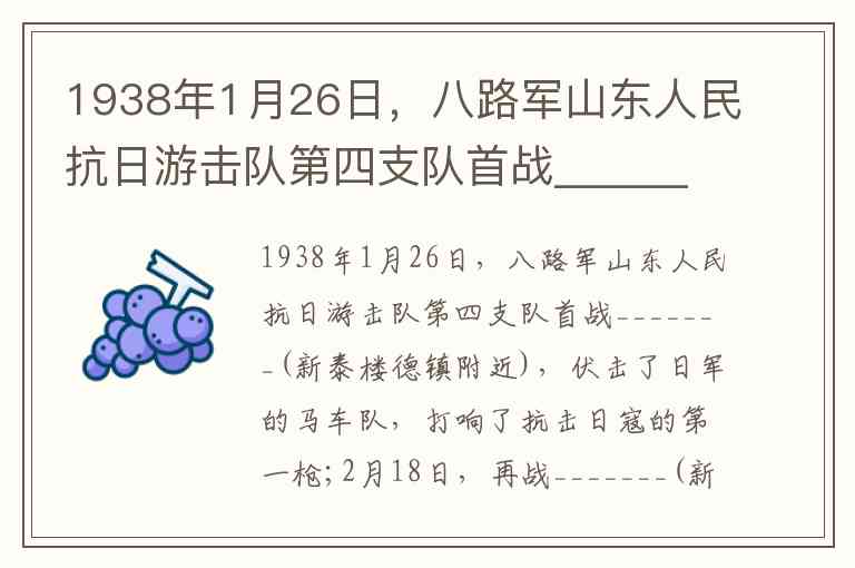 1938年1月26日,八路军山东人民抗日游击队第四支队首战_______(新泰楼德镇附近),伏击了日军的马车队,打响了抗击日寇的第一枪;2月18日,再战_______(新泰西张庄镇),炸毁敌大小汽车各1辆,炸死炸伤日军40余人,其中有大佐一名。
