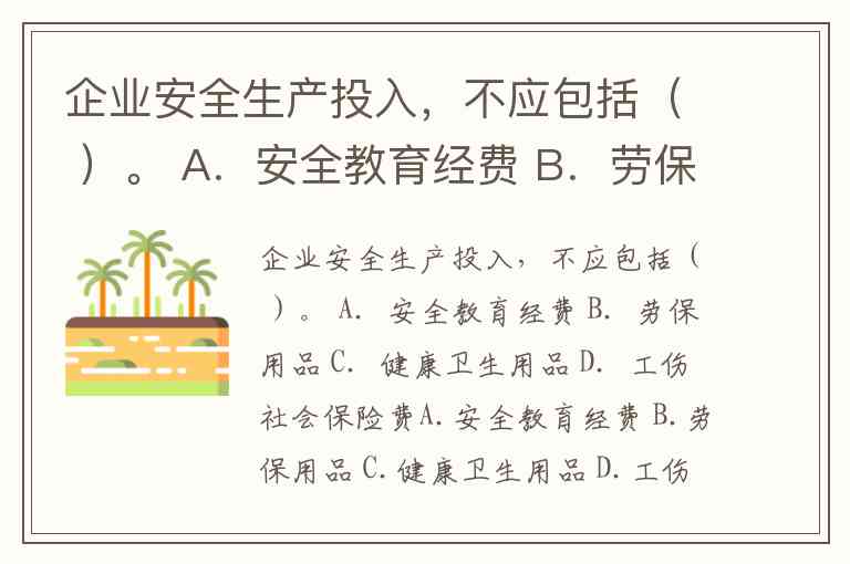 企业安全生产投入,不应包括( )。 A.安全教育经费 B.劳保用品 C.健康卫生用品 D.工伤社会保险费A.安全教育经费 B.劳保用品 C.健康卫生用品 D.工伤社会保险费