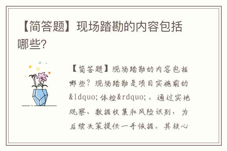 现场踏勘是项目实施前的“体检”,通过实地观察、数据收集和风险识别,为后续决策提供一手依据。其核心内容可分为基础环境调查、工程条件核查、风险与资源评估三大维度,具体实施需结合项目类型(如招投标、施工、结算审核)调整侧重点。