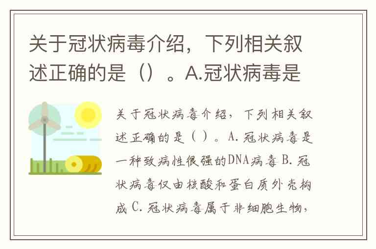 关于冠状病毒介绍,下列相关叙述正确的是()。A.冠状病毒是一种致病性很强的DNA病毒 B.冠状病毒仅由核酸和蛋白质外壳构成 C.冠状病毒属于非细胞生物,不能独立代谢 D.冠状病毒只感染人体,不能感染其它动物