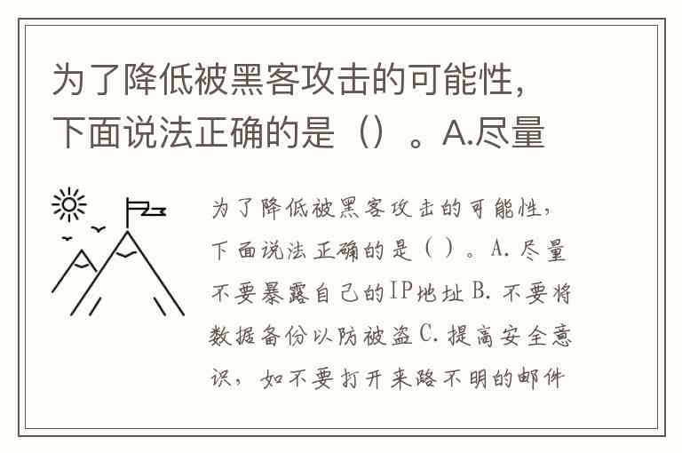 为了降低被黑客攻击的可能性,下面说法正确的是()。A.尽量不要暴露自己的IP地址 B.不要将数据备份以防被盗 C.提高安全意识,如不要打开来路不明的邮件 D.安装杀毒软件并及时升级病毒库 E.使用防火墙也是抵御黑客攻击的一种有效手段
