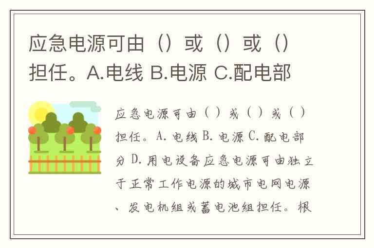 应急电源可由()或()或()担任。A.电线 B.电源 C.配电部分 D.用电设备