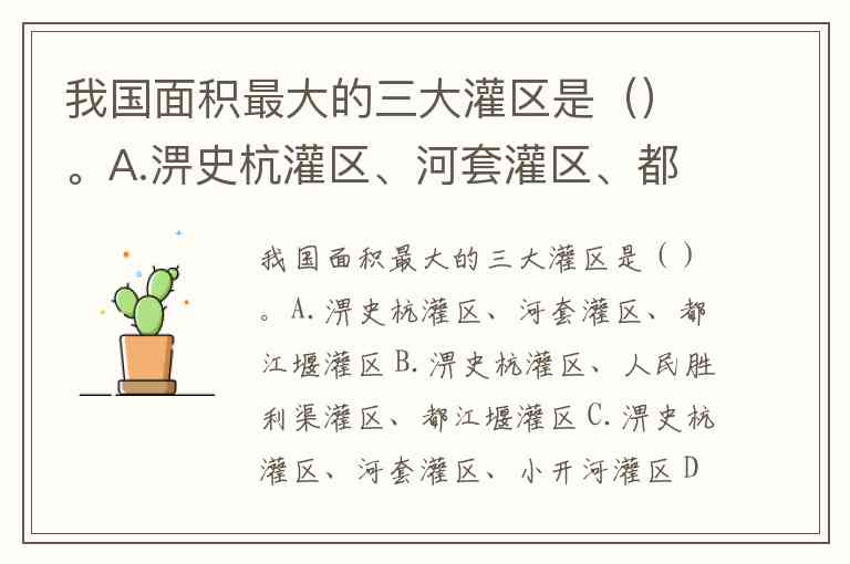 我国面积最大的三大灌区是()。A.淠史杭灌区、河套灌区、都江堰灌区 B.淠史杭灌区、人民胜利渠灌区、都江堰灌区 C.淠史杭灌区、河套灌区、小开河灌区 D.高邮灌区、河套灌区、都江堰灌区