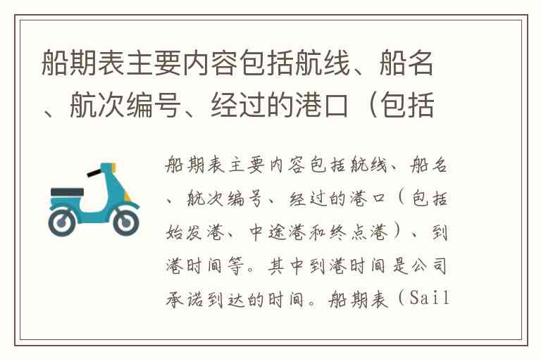 船期表主要内容包括航线、船名、航次编号、经过的港口(包括始发港、中途港和终点港)、到港时间等。其中到港时间是公司承诺到达的时间。