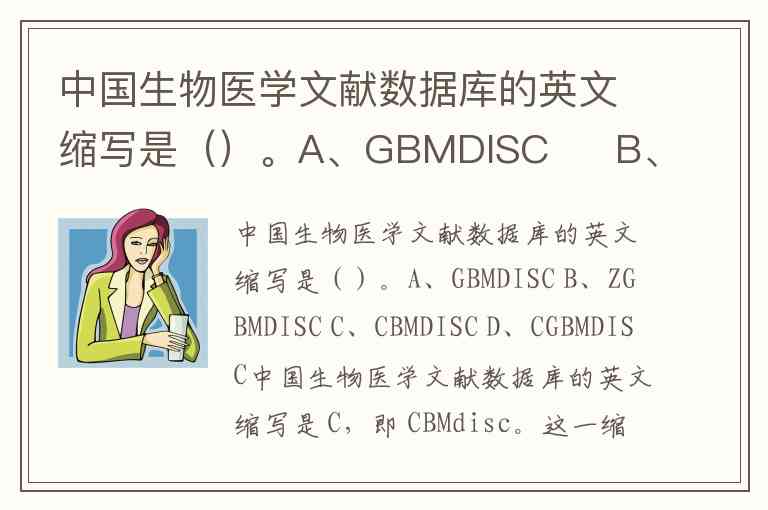 从文档信息来看,多个来源明确指出该数据库的标准缩写为 CBMdisc。例如,在专门针对该问题的试题及答案解析中,93%的用户校对结果和标准答案均选择 C 选项。此外,数据库的官方描述也提到其英文全称为 "China BioMedical literature database",进一步验证了缩写的构成逻辑。