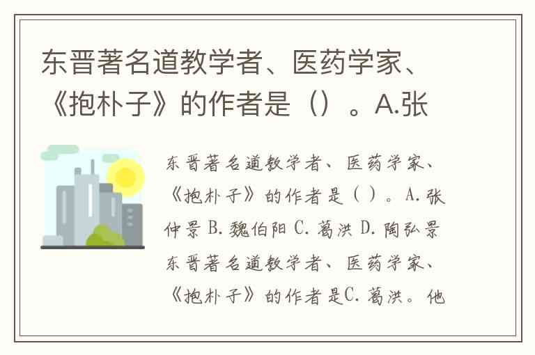 东晋著名道教学者、医药学家、《抱朴子》的作者是C.葛洪。他自号“抱朴子”,这一称号源自《道德经》“见素抱朴”的理念,既体现其思想追求,也成为其代表作的名称。
