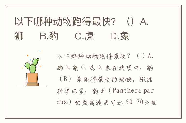 以下哪种动物跑得最快?()A.狮 B.豹 C.虎 D.象