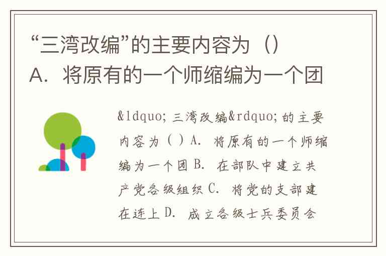 “三湾改编”的主要内容为()A.将原有的一个师缩编为一个团 B.在部队中建立共产党各级组织 C.将党的支部建在连上 D.成立各级士兵委员会,部队内部实现民主管理