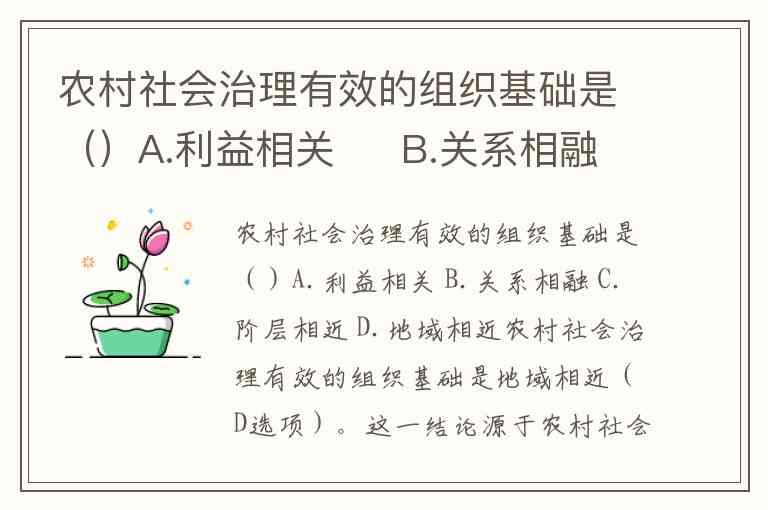 农村社会治理有效的组织基础是()A.利益相关 B.关系相融 C.阶层相近 D.地域相近