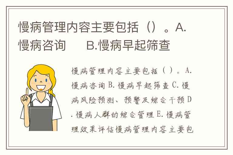 慢病管理内容主要包括()。A.慢病咨询 B.慢病早起筛查 C.慢病风险预测、预警及综合干预 D.慢病人群的综合管理 E.慢病管理效果评估