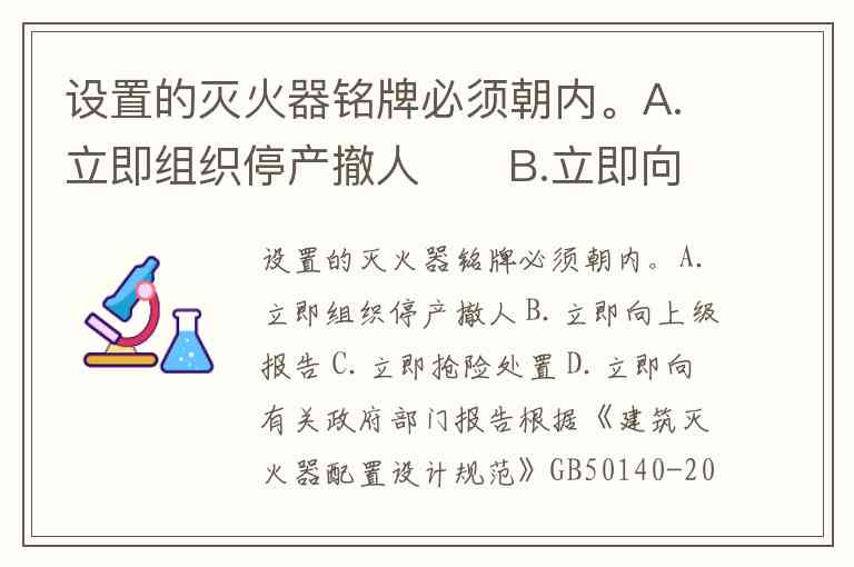 设置的灭火器铭牌必须朝内。A.立即组织停产撤人 B.立即向上级报告 C.立即抢险处置 D.立即向有关政府部门报告