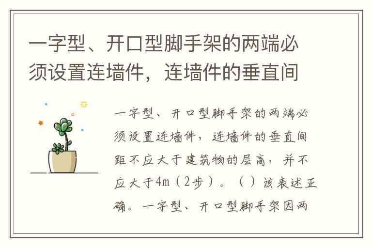 一字型、开口型脚手架的两端必须设置连墙件,连墙件的垂直间距不应大于建筑物的层高,并不应大于4m(2步)。()