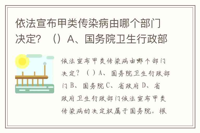 依法宣布甲类传染病由哪个部门决定?()A、国务院卫生行政部门 B、国务院 C、省政府 D、省政府卫生行政部门
