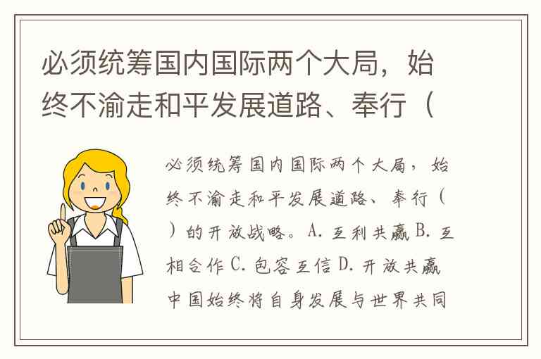 必须统筹国内国际两个大局,始终不渝走和平发展道路、奉行()的开放战略。A.互利共赢 B.互相合作 C.包容互信 D.开放共赢