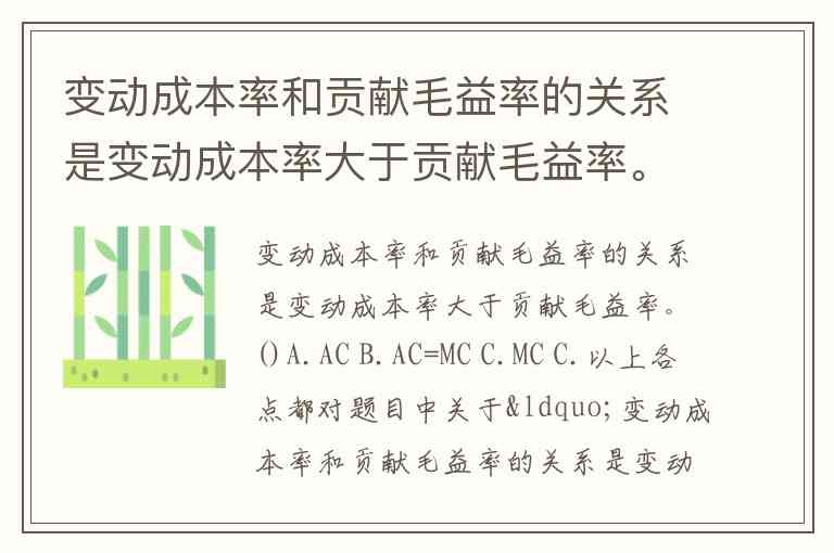 题目中关于“变动成本率和贡献毛益率的关系是变动成本率大于贡献毛益率”的说法存在概念混淆,且选项部分(AC、MC)与题干核心概念无关,可能存在题目排版或知识点混淆问题。以下从基础概念出发澄清核心关系: