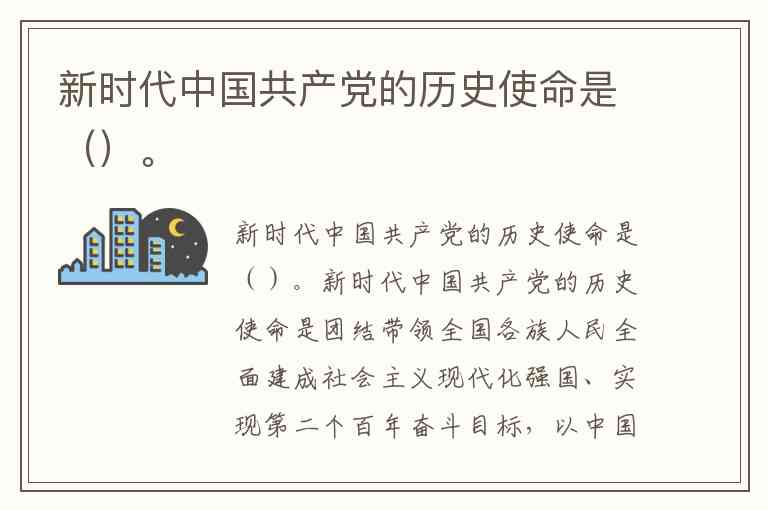 新时代中国共产党的历史使命是团结带领全国各族人民全面建成社会主义现代化强国、实现第二个百年奋斗目标,以中国式现代化全面推进中华民族伟大复兴。这一使命的确立,根植于中国共产党百年奋斗的历史逻辑——自诞生之日起,党就将"为中国人民谋幸福、为中华民族谋复兴"作为初心使命,历经革命、建设、改革各个历史时期的接续奋斗,成功实现了从站起来、富起来到强起来的伟大飞跃。