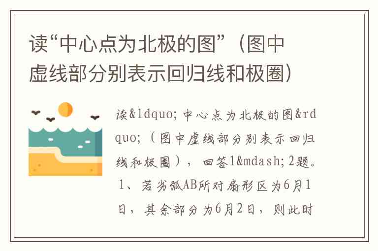读“中心点为北极的图”(图中虚线部分别表示回归线和极圈),回答1—2题。 1、若劣弧AB所对扇形区为6月1日,其余部分为6月2日,则此时北京时间应为 [ ] A、6月2日14:00 B、6月1日8:00 C、6月2日4:00 D、6月1日20:00 2、若AC弧为晨线,下列说法正确的是 [ ] A、北极圈出现极昼现象 B、广东各地昼短夜长 C、B点地方时为0时 D、北极圈内极夜范围将逐渐扩大