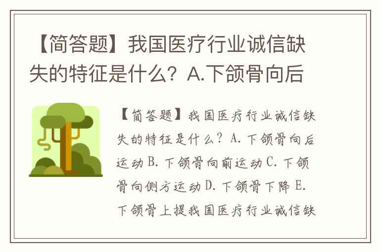 【简答题】我国医疗行业诚信缺失的特征是什么?A.下颌骨向后运动 B.下颌骨向前运动 C.下颌骨向侧方运动 D.下颌骨下降 E.下颌骨上提