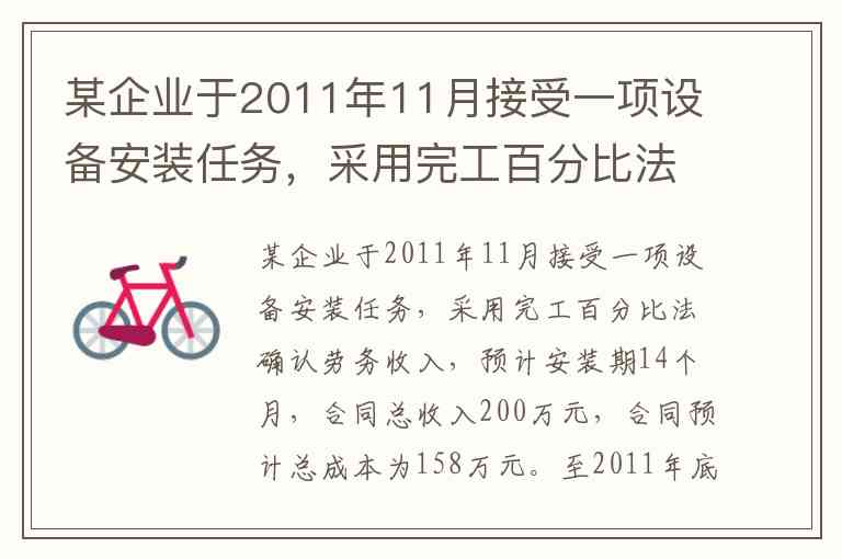某企业于2011年11月接受一项设备安装任务,采用完工百分比法确认劳务收入,预计安装期14个月,合同总收入200万元,合同预计总成本为158万元。至2011年底已预收款项160万元,余款在安装完成时收回,至2012年12月31日实际发生成本152万元,预计还将发生成本8万元。2011年已确认收入20万元。则该企业2012年度确认收入为( )万元。 A. 170 B. 152 C. 200 D. 158
