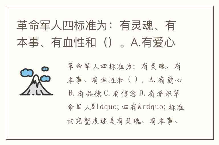 革命军人四标准为:有灵魂、有本事、有血性和()。A.有爱心 B.有品德 C.有信念 D.有学识