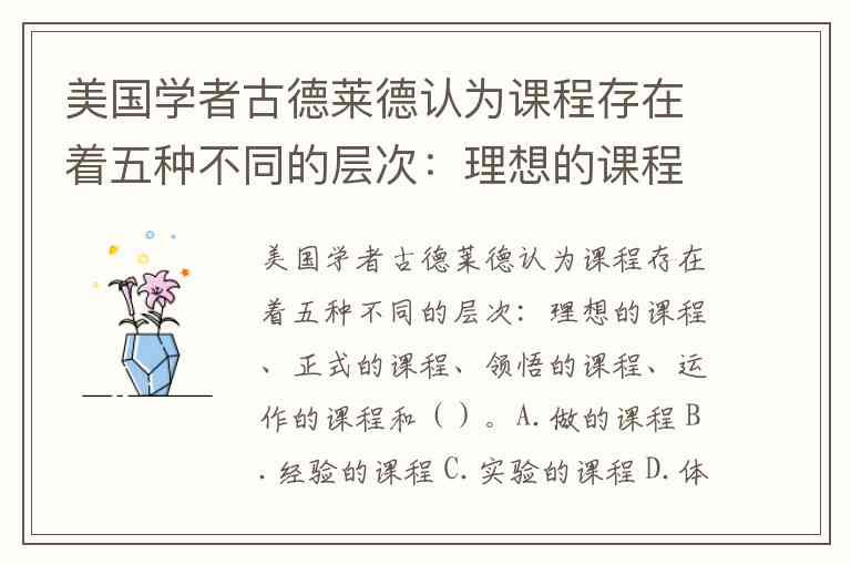 美国学者古德莱德认为课程存在着五种不同的层次:理想的课程、正式的课程、领悟的课程、运作的课程和()。A.做的课程 B.经验的课程 C.实验的课程 D.体验的课程