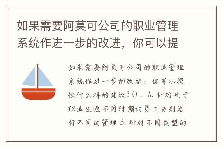 如果需要阿莫可公司的职业管理系统作进一步的改进,你可以提供什么样的建议?()。A.针对处于职业生涯不同时期的员工分别进行不同的管理 B.针对不同类型的员工制定不同的职业生涯管理方案 C.让员工自己进行职业生涯管理即可,公司不必参与 D.无需做任何改进