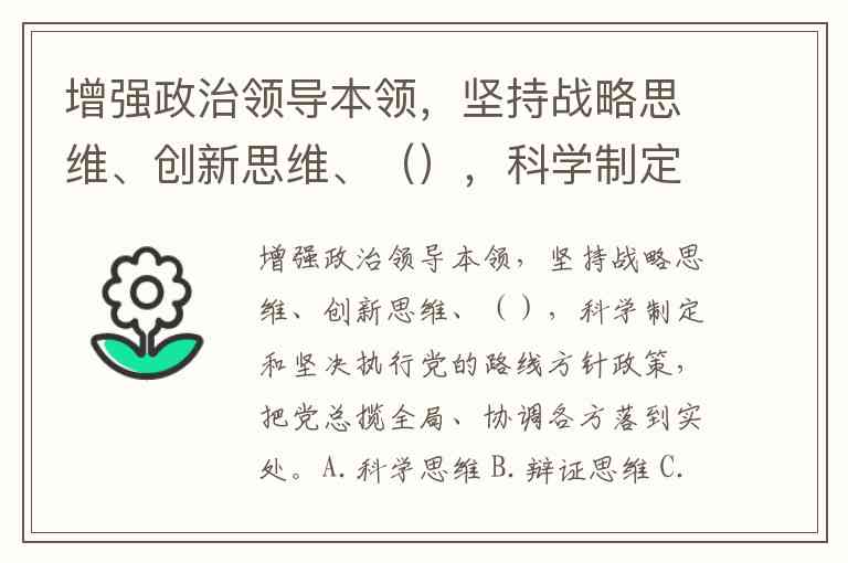 增强政治领导本领,坚持战略思维、创新思维、(),科学制定和坚决执行党的路线方针政策,把党总揽全局、协调各方落到实处。A.科学思维 B.辩证思维 C.法治思维 D.底线思维