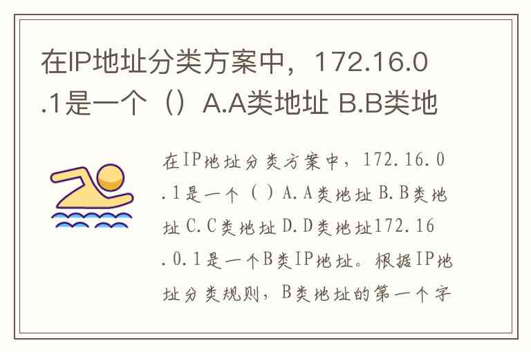 在IP地址分类方案中,172.16.0.1是一个()A.A类地址 B.B类地址 C.C类地址 D.D类地址