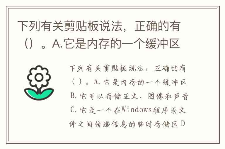 下列有关剪贴板说法,正确的有()。A.它是内存的一个缓冲区 B.它可以存储正文、图像和声音 C.它是一个在Windows程序或文件之间传递信息的临时存储区 D.在应用程序中可用paste(粘贴)将信息复制到剪贴版