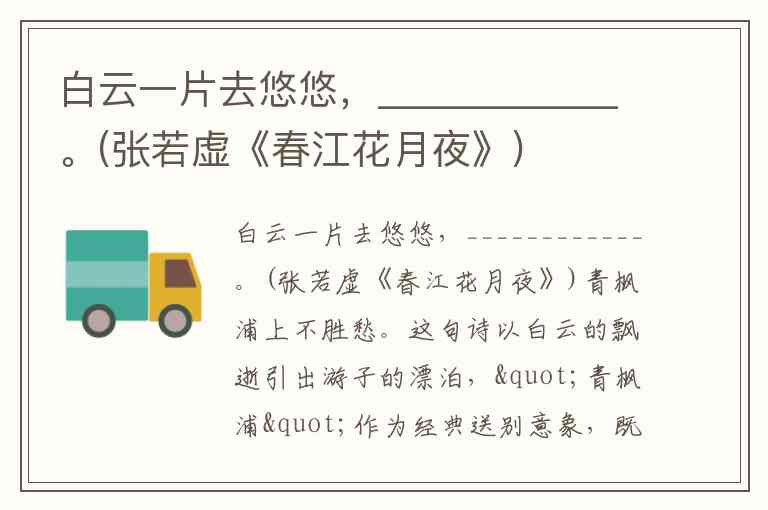 青枫浦上不胜愁。这句诗以白云的飘逝引出游子的漂泊,"青枫浦"作为经典送别意象,既呼应了前文"白云"的飘荡感,又通过"不胜愁"将自然景象与游子思妇的离愁别绪紧密相连,展现了《春江花月夜》以景喻情、情景交融的艺术特色。全诗正是通过这样的意象串联,将游子思妇的离愁别绪置于春江月夜的广阔背景中,创造出空灵澄澈又情意绵邈的美学境界。