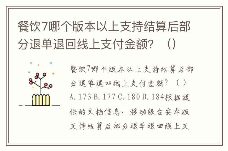 餐饮7哪个版本以上支持结算后部分退单退回线上支付金额?()A.173 B.177 C.180 D.184