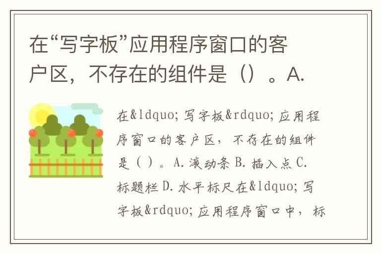 在“写字板”应用程序窗口的客户区,不存在的组件是()。A.滚动条 B.插入点 C.标题栏 D.水平标尺