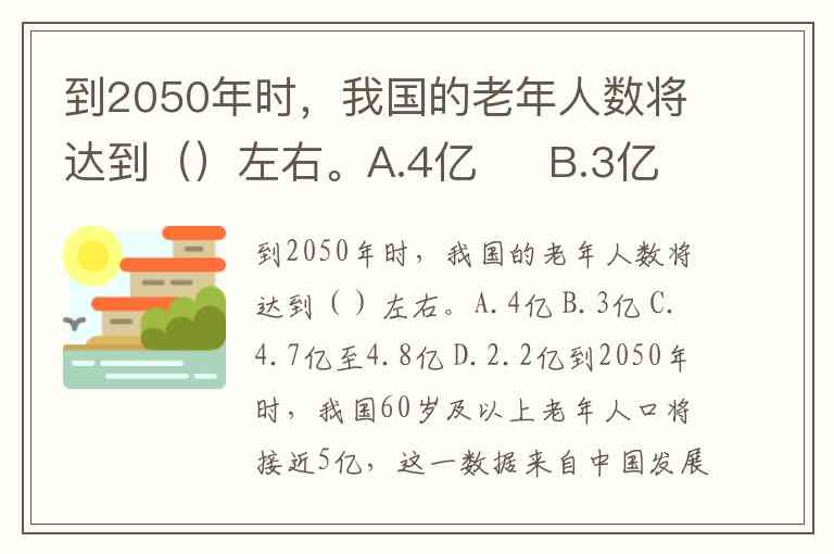 到2050年时,我国的老年人数将达到()左右。A.4亿 B.3亿 C.4.7亿至4.8亿 D.2.2亿