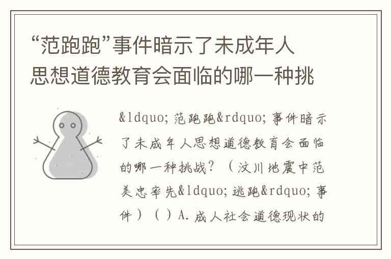 “范跑跑”事件暗示了未成年人思想道德教育会面临的哪一种挑战?(汶川地震中范美忠率先“逃跑”事件)()A.成人社会道德现状的挑战 B.思想道德教育中的形而上学 C.思想道德教育理论研究滞后 D.价值观多元化的挑战