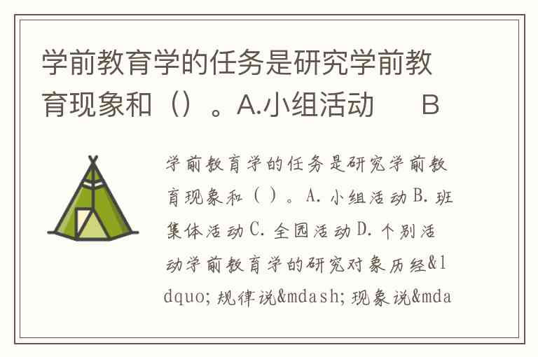 学前教育学的任务是研究学前教育现象和()。A.小组活动 B.班集体活动 C.全园活动 D.个别活动