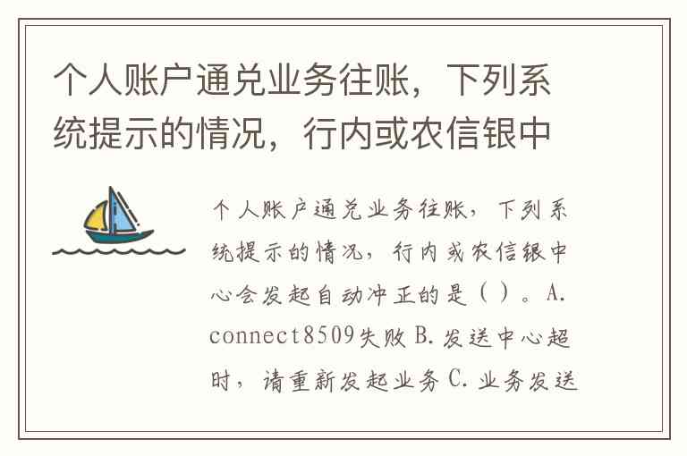 个人账户通兑业务往账,下列系统提示的情况,行内或农信银中心会发起自动冲正的是()。A.connect8509失败 B.发送中心超时,请重新发起业务 C.业务发送失败,请重新发起业务 D.NPSXXXXXXXX