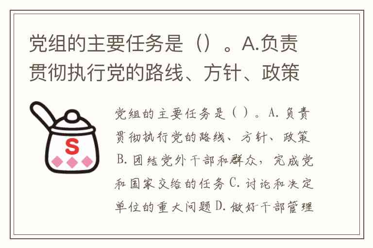 党组的主要任务是()。A.负责贯彻执行党的路线、方针、政策 B.团结党外干部和群众,完成党和国家交给的任务 C.讨论和决定单位的重大问题 D.做好干部管理工作