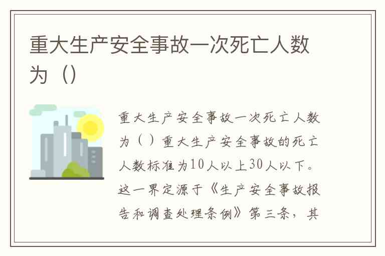 重大生产安全事故的死亡人数标准为10人以上30人以下。这一界定源于《生产安全事故报告和调查处理条例》第三条,其中明确将事故划分为四个等级,重大事故需满足死亡人数处于10至30人区间(含10人,不含30人),或50至100人重伤,或5000万元至1亿元直接经济损失三个条件之一。
