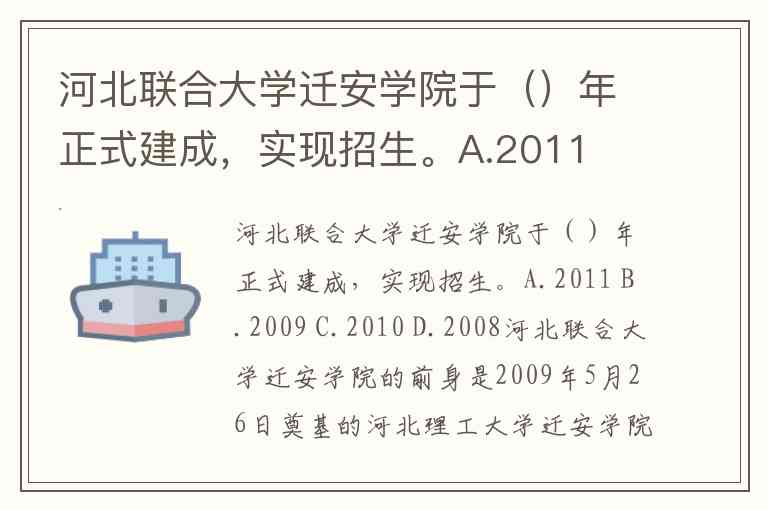 河北联合大学迁安学院于()年正式建成,实现招生。A.2011 B.2009 C.2010 D.2008