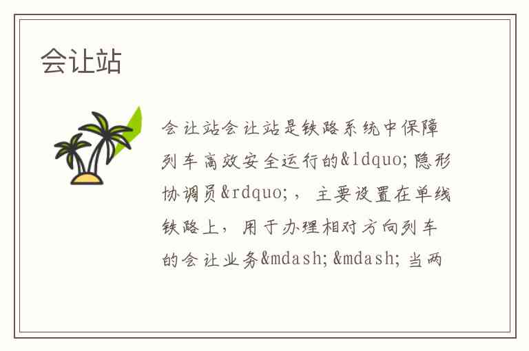 会让站是铁路系统中保障列车高效安全运行的“隐形协调员”,主要设置在单线铁路上,用于办理相对方向列车的会让业务——当两列火车相向而行时,一列需在会让站临时停靠,等待另一列通过后再继续行驶。这种看似简单的“错车”功能,实则是铁路网络高效运转的关键一环,尤其在客货运量增长或线路维修时发挥着不可替代的作用。