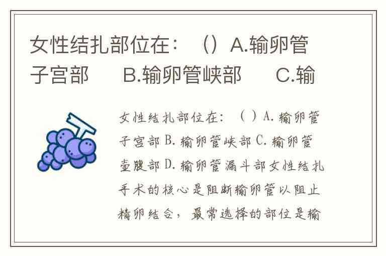女性结扎手术的核心是阻断输卵管以阻止精卵结合,最常选择的部位是输卵管峡部(B选项)。这一选择基于其解剖学特性:峡部位于输卵管起始段,连接子宫部与壶腹部,是输卵管中最狭窄且管壁厚、位置固定的部分。其管腔直径仅0.5-1毫米,血管分布较少,手术时易于夹持、结扎且不易损伤周围血管。