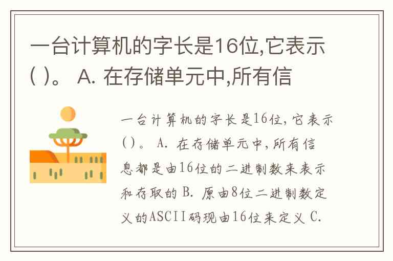 一台计算机的字长是16位,它表示( )。 A. 在存储单元中,所有信息都是由16位的二进制数来表示和存取的 B. 原由8位二进制数定义的ASCII码现由16位来定义 C. 原信息由二进制数存储的,现由十六进制数存储 D. 该计算机能处理的最大字符串是"16位”
