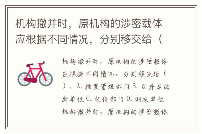 机构撤并时,原机构的涉密载体应根据不同情况,分别移交给()。A.档案管理部门 B.合并后的新单位 C.任何部门 D.制发单位
