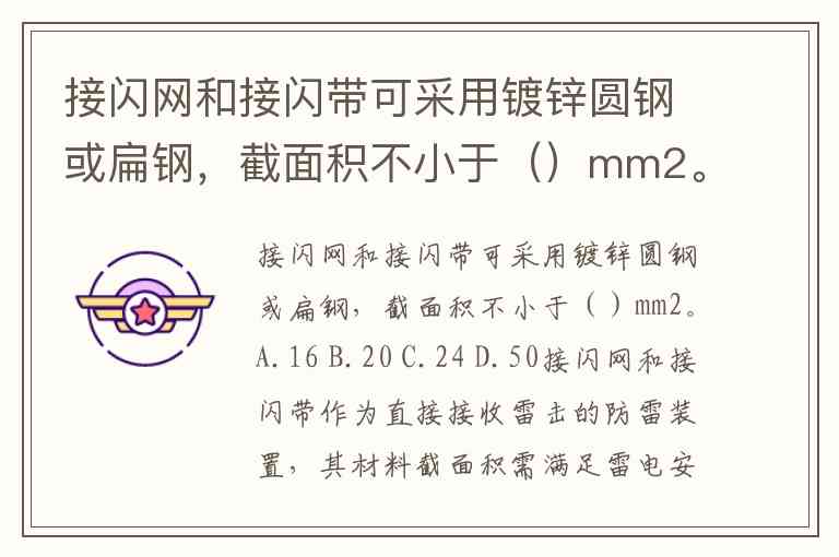 接闪网和接闪带可采用镀锌圆钢或扁钢,截面积不小于()mm2。A.16 B.20 C.24 D.50