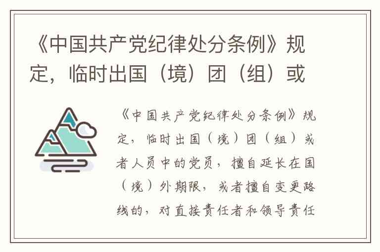 《中国共产党纪律处分条例》规定,临时出国(境)团(组)或者人员中的党员擅自延长在国(境)外期限或变更路线,若造成不良影响或者经济损失,对主要责任者给予警告或者严重警告处分;情节严重的,给予撤销党内职务处分。这一规定明确了纪律红线,既针对直接违规行为,也强调对领导责任的追究,体现了全面从严治党中对涉外活动纪律的严格要求。