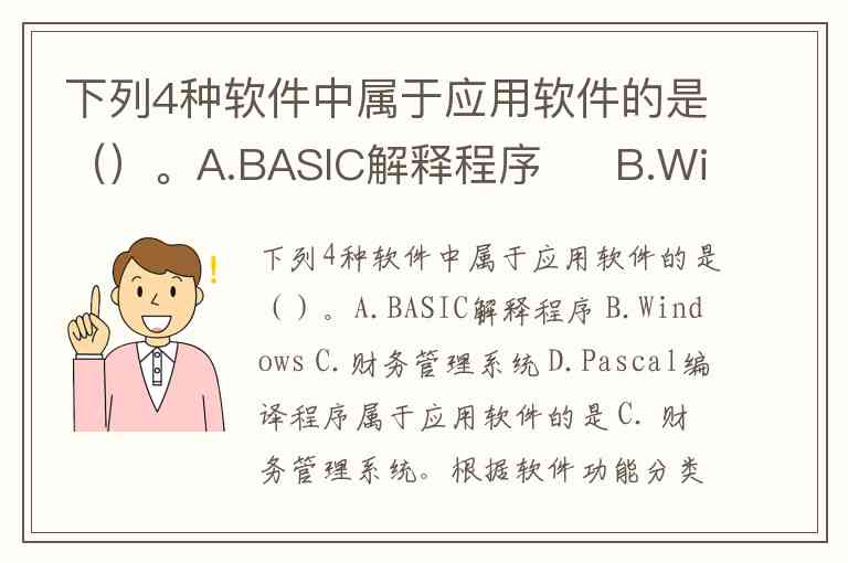 下列4种软件中属于应用软件的是()。A.BASIC解释程序 B.Windows C.财务管理系统 D.Pascal编译程序