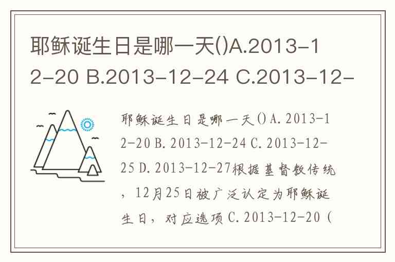 根据基督教传统,12月25日被广泛认定为耶稣诞生日,对应选项 C.2013-12-20(注:应为2013-12-25,选项可能存在笔误)。这一日期虽非《圣经》明确记载,却是公元4世纪后教会为统一庆祝而确立的宗教传统。